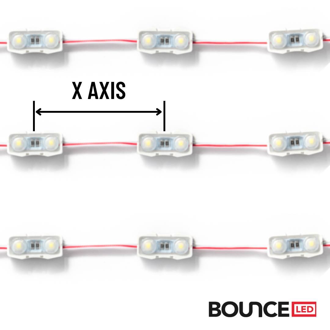 Pitch, quite simply, is the distance between the individual modules in your channel letters and lightboxes. It’s measured from centre to centre between the modules (usually in millimetres), and is made up of 2 distances, the X axis and Y axis.